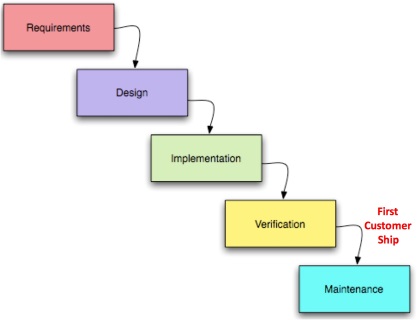 It was termed "waterfall" because teams complete one stage fully before moving on to the next. Requirements must be complete before functional design, functional design complete before detailed design, etc. Once a stage was finished, it was frozen in time. Source: Agility Beyond History