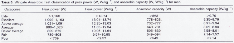 - Zupan MF, Arata AW, Dawson LH, Wile AL, Payn TL, Hannon ME. Wingate Anaerobic Test peak power and anaerobic capacity classifications for men and women intercollegiate athletes. J Strength Cond Res. 2009;23(9):2598-2604. doi:10.1519/JSC.0b013e3181b1b21b